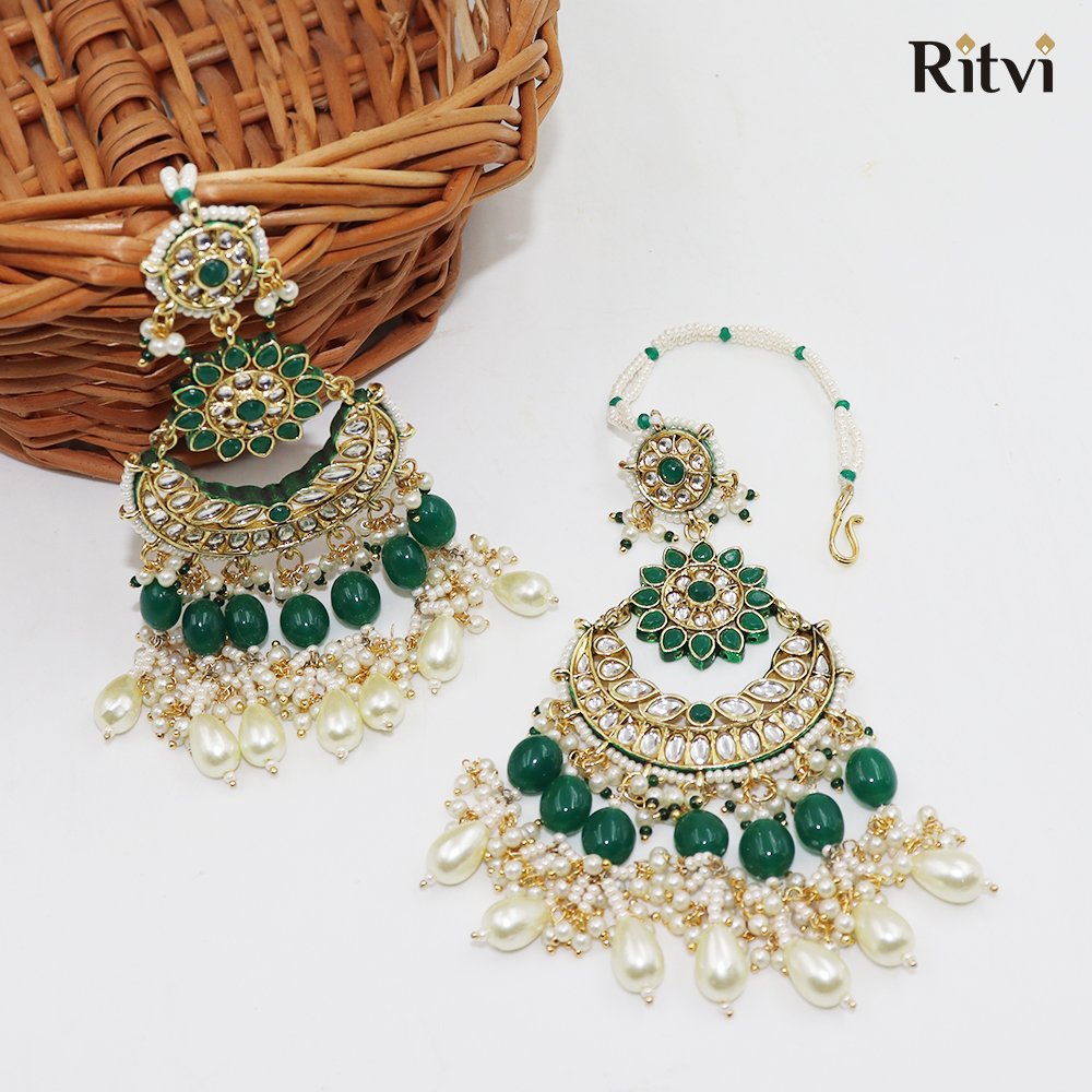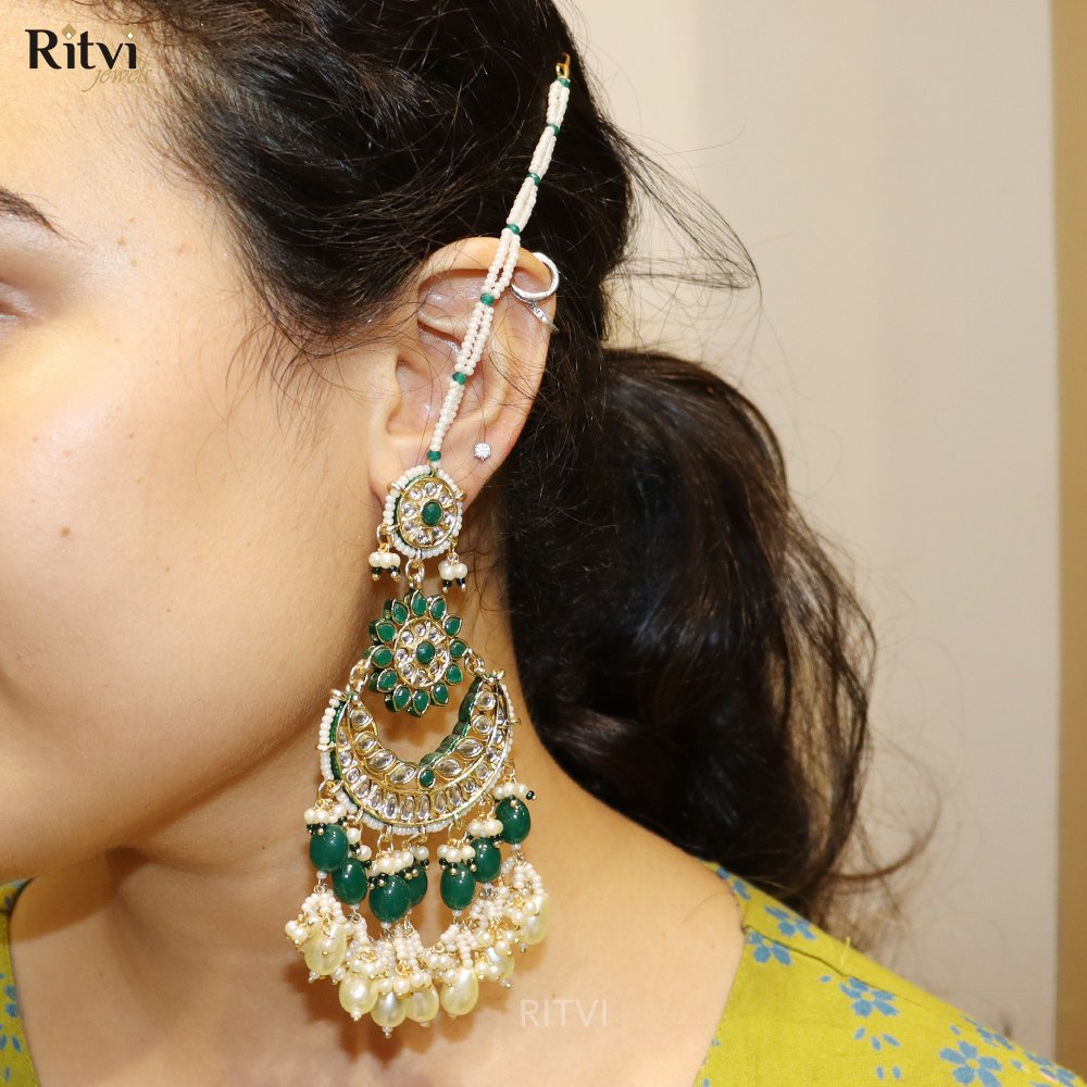 These Emerald Green Drop Kundan earrings feature exquisite Kundan work with emerald green drops, combining traditional charm with a modern twist.