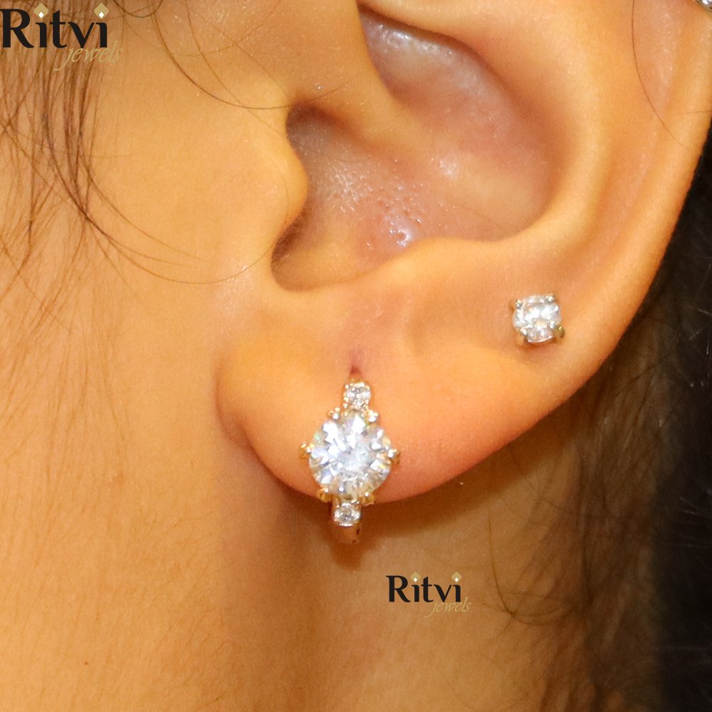 These radiant earrings feature a brilliant round-cut central stone set in elegant rose gold, flanked by sparkling accents. Their timeless design adds a graceful charm to both daily and formal looks.