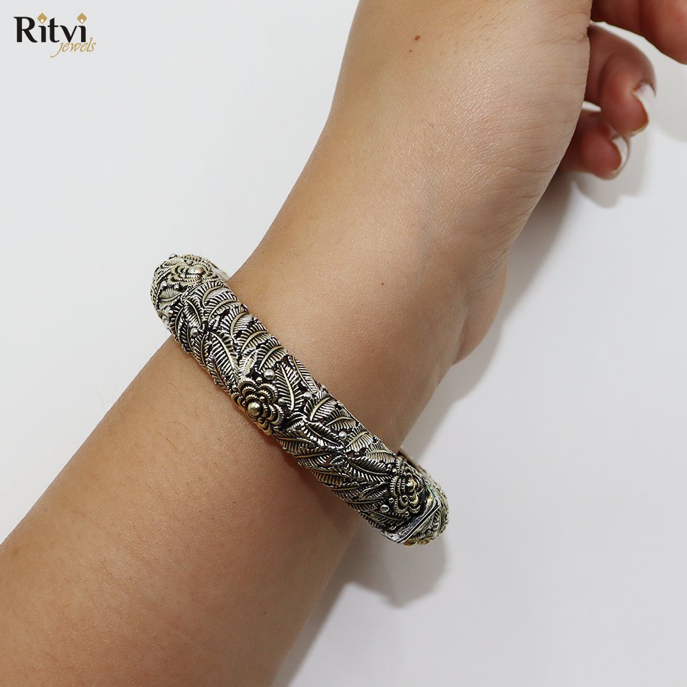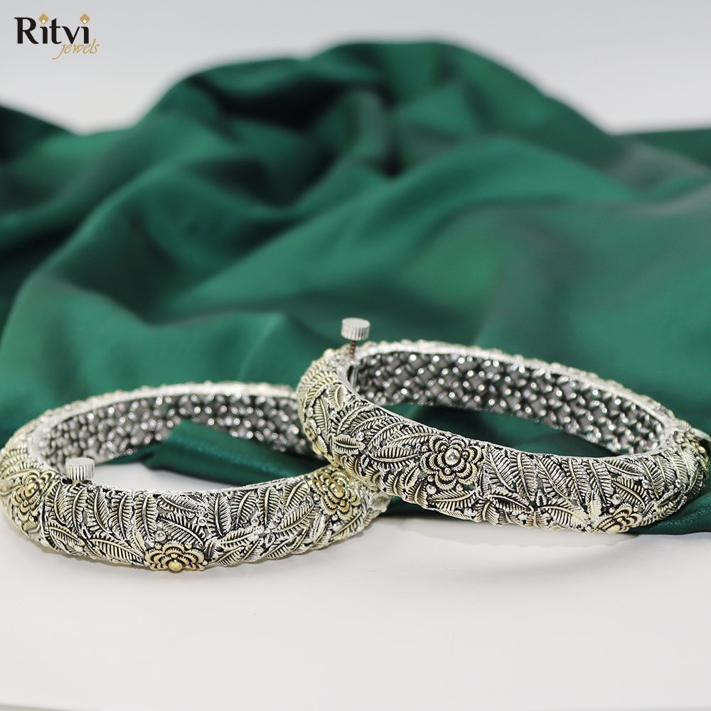 These oxidized silver bangles feature intricate floral and leaf patterns, reflecting a rich antique finish. With their traditional craftsmanship and vintage appeal, they are perfect for ethnic outfits, adding elegance and timeless charm to festive or cultural celebrations.