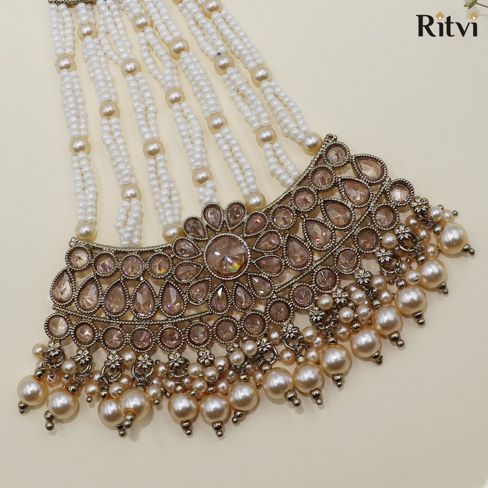 This majestic bridal passa is a timeless masterpiece, designed to exude royal elegance. Featuring a grand, intricately crafted frame, it is adorned with polki or reverse AD stones, offering an antique charm with a brilliant sparkle.