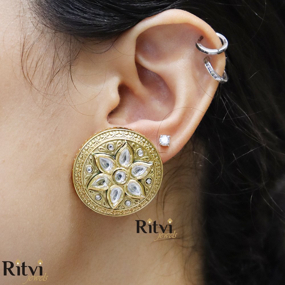 These elegant round stud earrings feature a floral motif adorned with teardrop-shaped white stones and intricate gold detailing. A timeless design by Ritvi Jewels, perfect for weddings, festivals, or formal occasions.