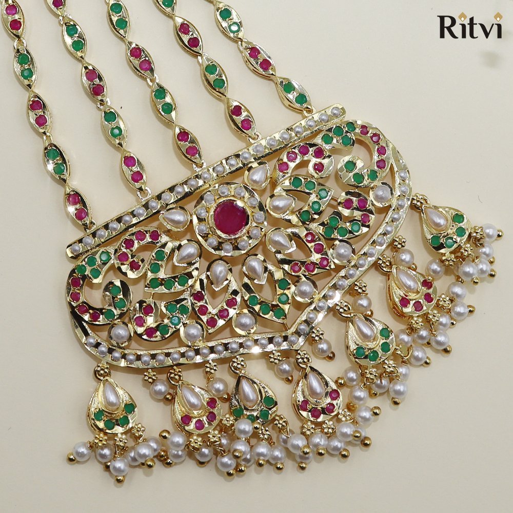 This exquisite Jadau Passa is a timeless statement piece, meticulously handcrafted with intricate gold detailing. Adorned with vibrant magenta and green stones, it showcases a regal blend of tradition and elegance.