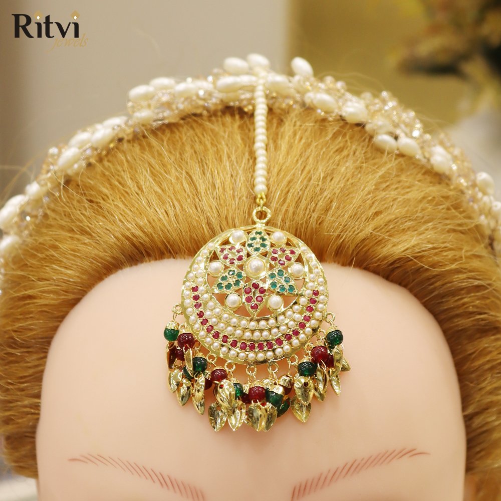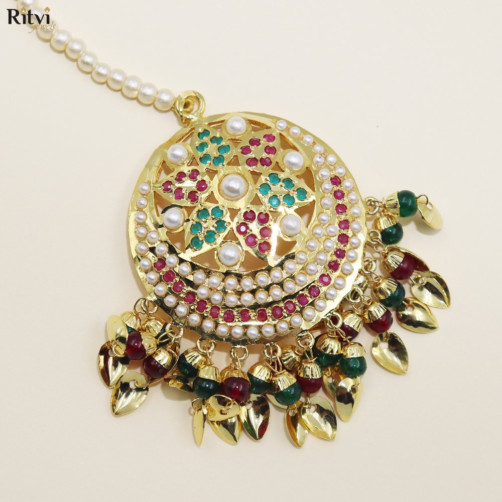 Vastika Jadau Maang Tikka in a Punjabi look is a stunning headpiece crafted with traditional jadau work, featuring uncut diamonds, gemstones, and gold detailing. Perfect for pairing with Punjabi bridal or festive attire, this maang tikka adds an elegant, regal charm, enhancing the beauty of cultural ensembles with timeless artistry.