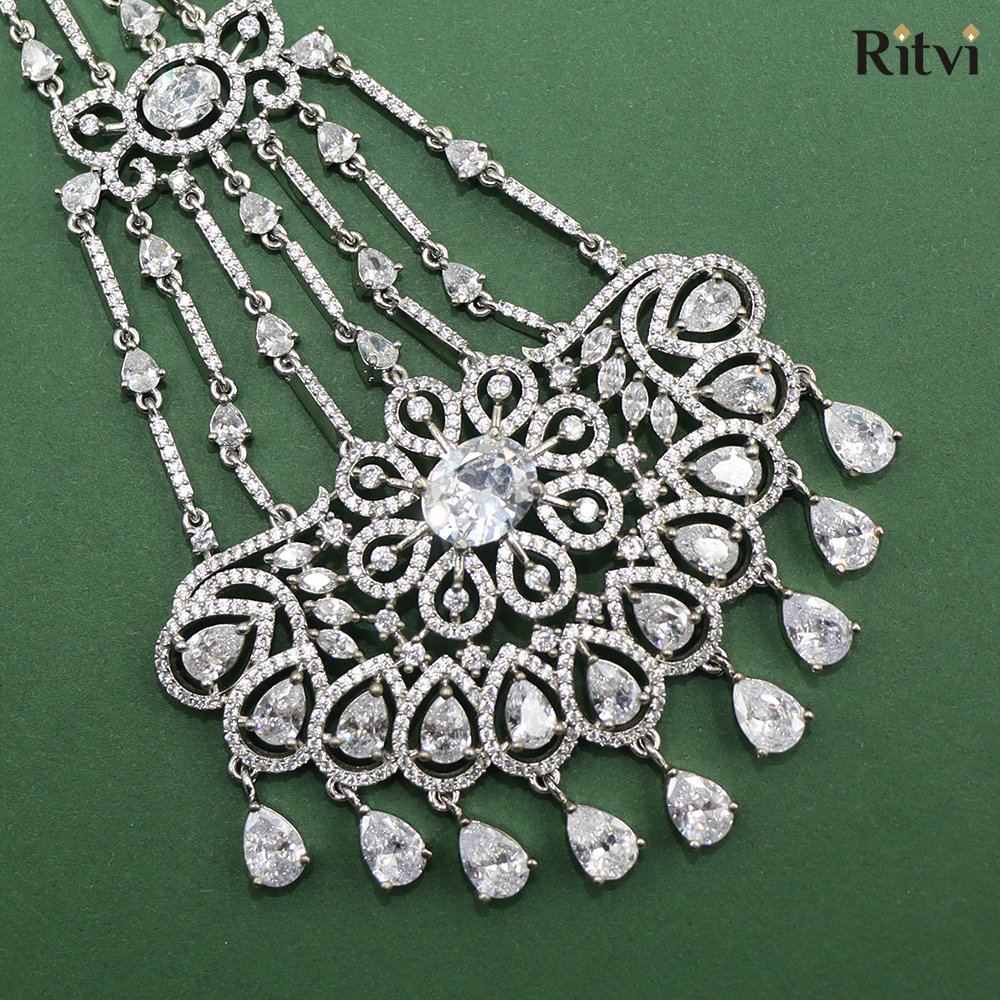 This grand bridal passa is a breathtaking fusion of tradition and modern elegance. Crafted in silver color plating, it exudes a vintage charm while maintaining a regal allure.